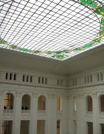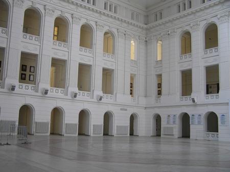 Образующее замкнутый прямоугольник в плане четырехэтажное здание главного корпуса имеет так называемый "крытый двор" на 2000 мест, используемый как актовый и читальный зал.